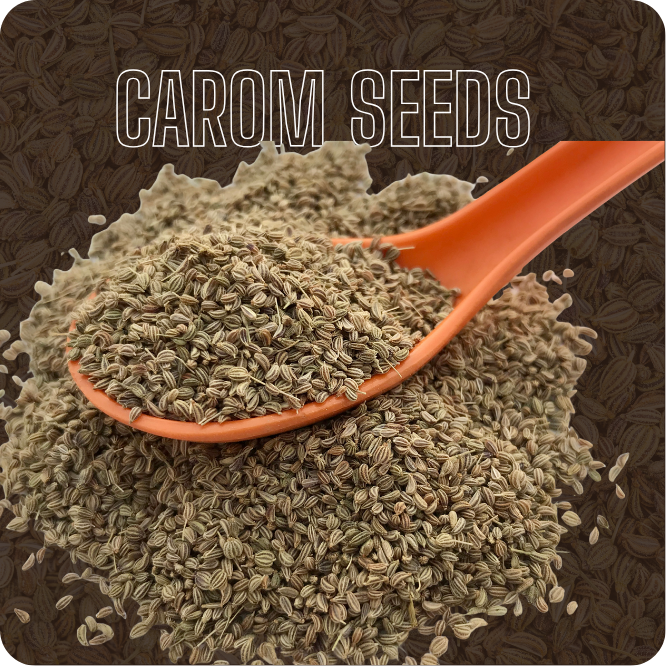 Carom Seeds, known as Ajwain in India, are the dried fruits of the Trachyspermum ammi plant. These small, ridged, grayish seeds resemble celery or cumin in appearance but are much more pungent, with a flavor similar to thyme due to their high thymol content.